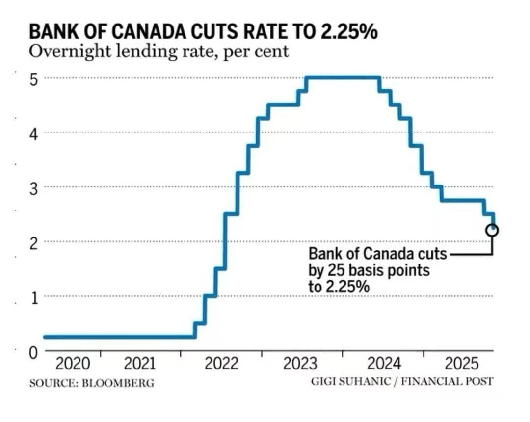 Bank of Canada announced a 25-basis-point rate cut on Oct 29, 2025, reducing its target for the overnight rate to 2.25%, with the Bank Rate at 2.50% and the deposit rate at 2.20%.