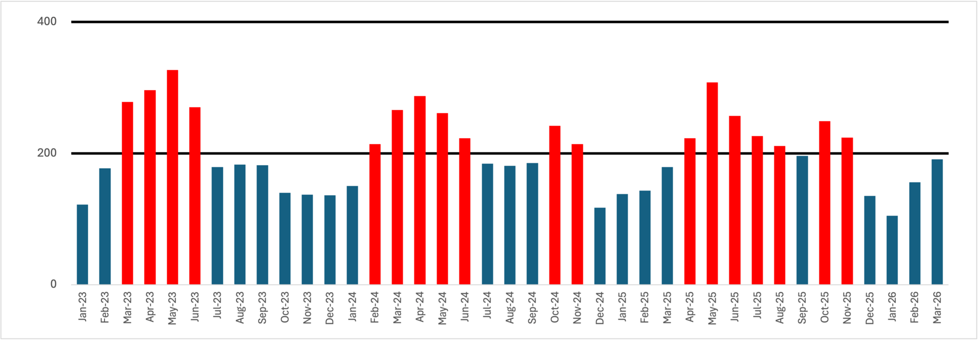 In 2025, the strongest stretch again fell between April and August, with May peaking at over 300 homes sold.